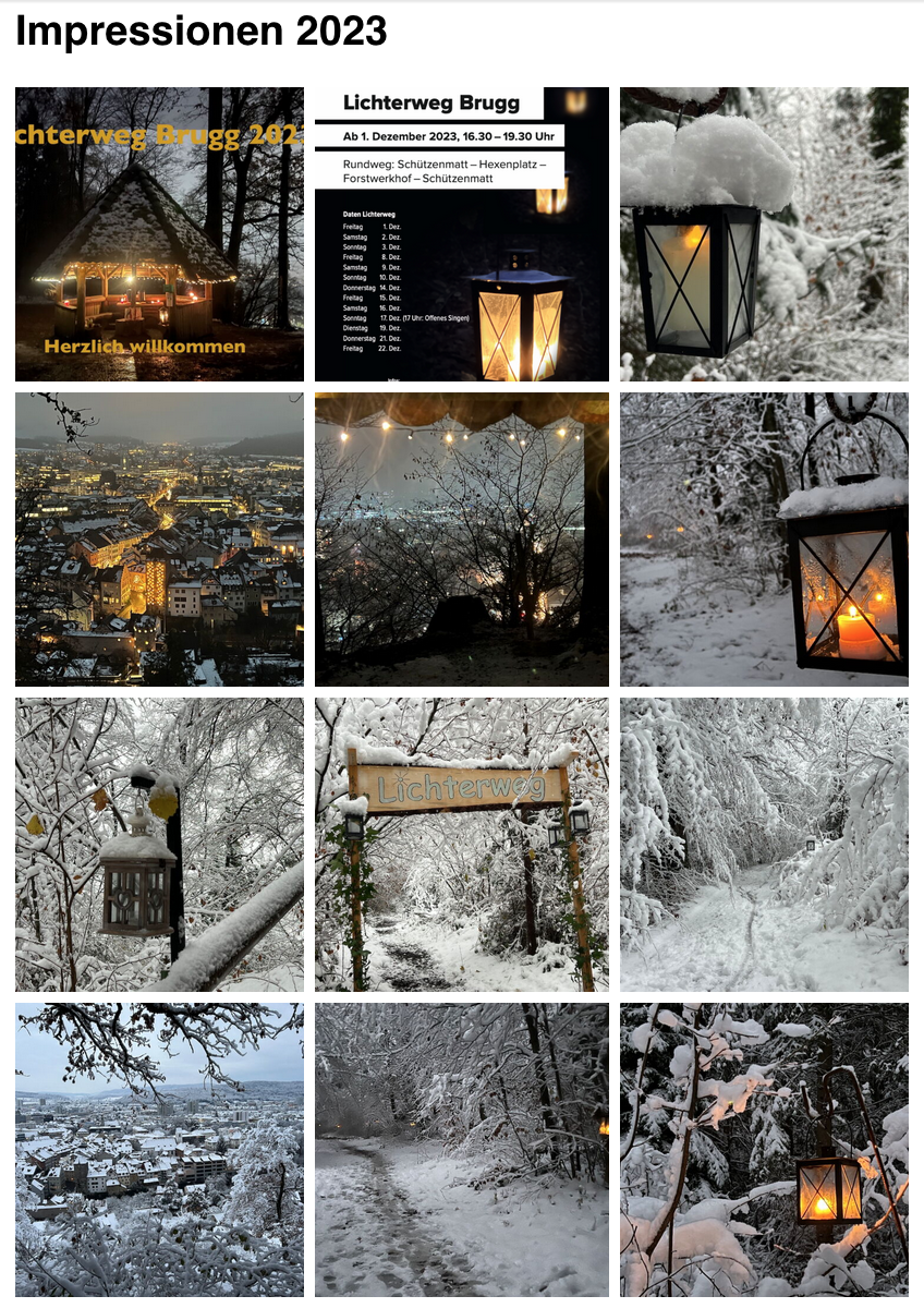 Der Lichterweg Brugg 2024 wird vom 29. November bis 22. Dezember jeweils von Freitag bis Sonntag von 16.30 bis 19.30 Uhr erleuchtet. Ein Rundweg führt uns von der Schützenmatte (Parkplatz) via Hansfluhsteig zum Hexenplatz, wo die Aussicht auf die beleuchtete Stadt Brugg phänomenal ist. Hier brennen zwei wärmende Feuer, die auch zum Brötle genutzt werden dürfen. Danach weisen die Lichter den Weg zum Forstwerkhof. Von dort geht es den Remigersteig hinunter und dann zurück zur Schützenmatt (links) oder zum Bahnhof (rechts).